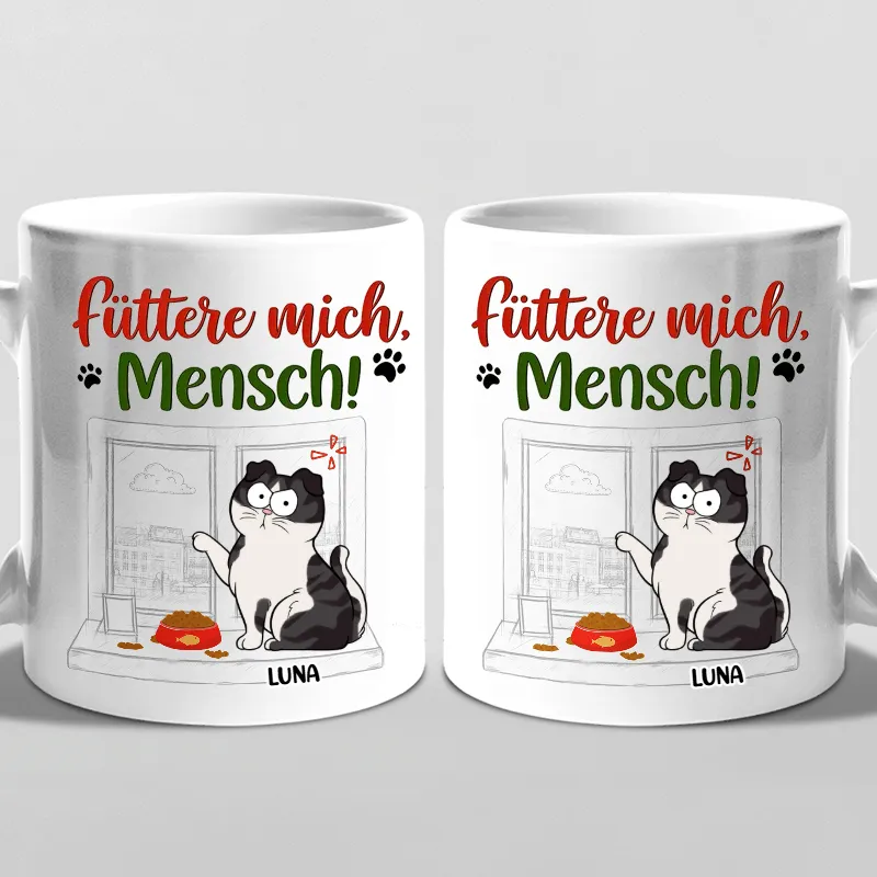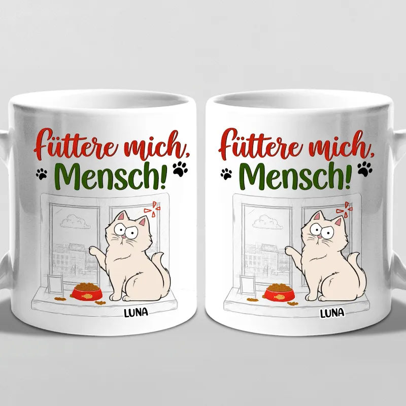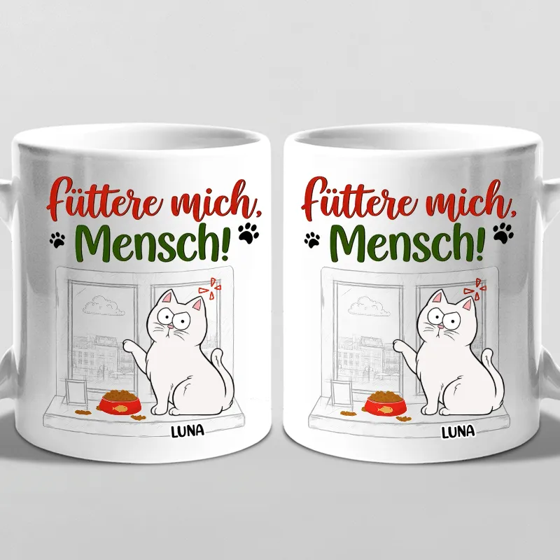 DIYTREE Personalisierte Katze Tasse Individuell mit Katzenrasse, Namen lustigem Spruch Füttere mich, Mensch, Geschenk für Katzenliebhaber