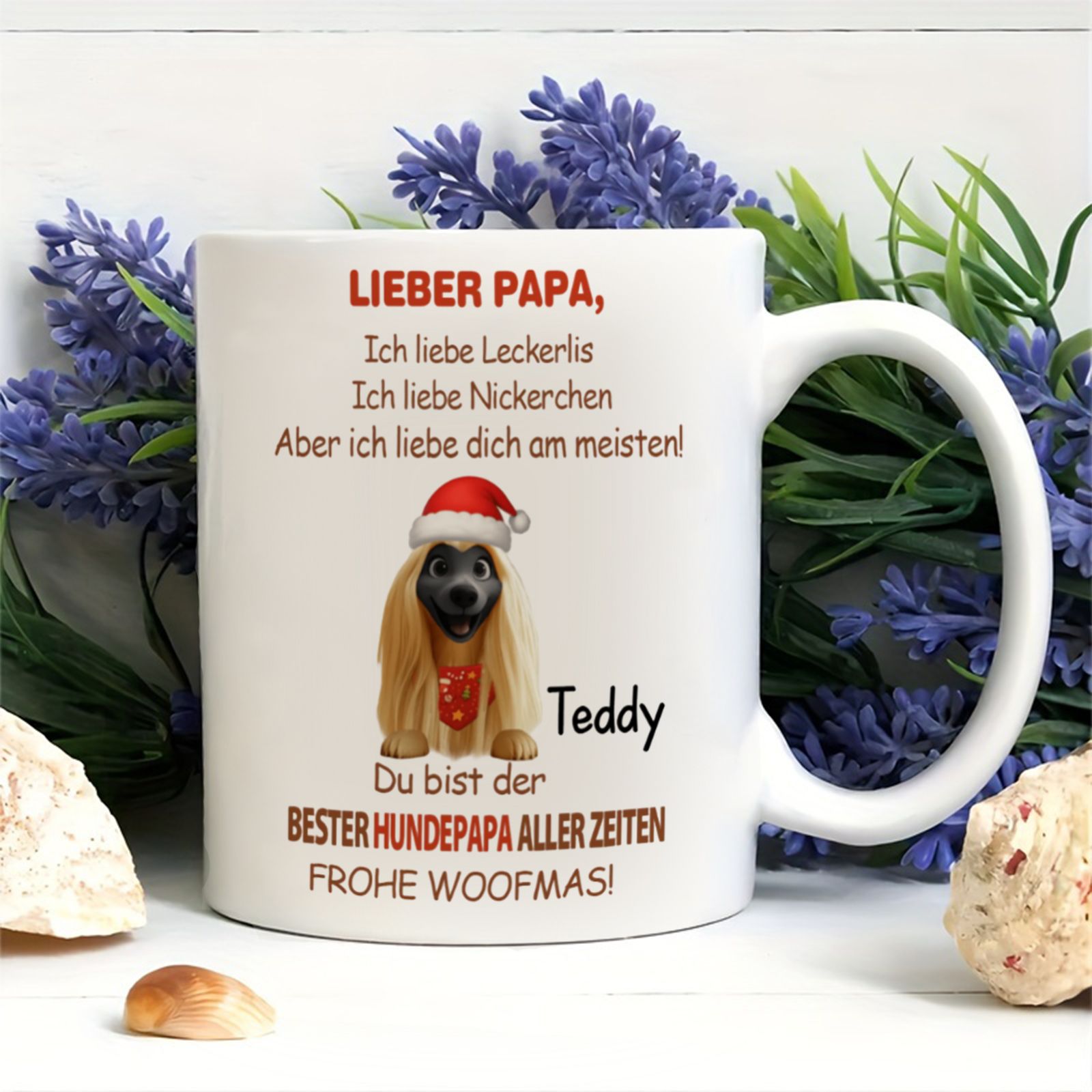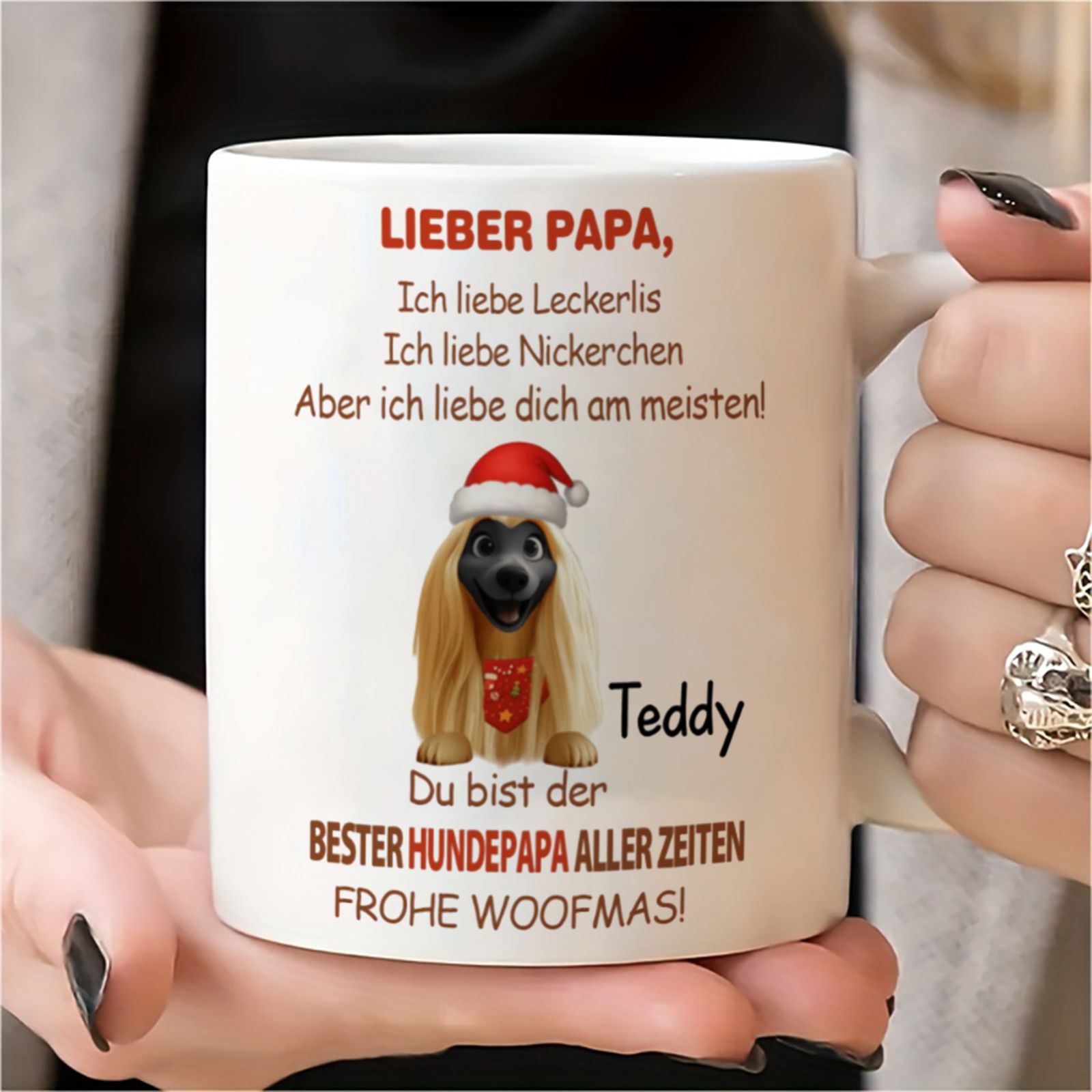 DIYTREE Personalisierter Hundepapa Weihnachts Tasse – Individuell mit 1-4 Hunden, Namen & lustigem Spruch, perfektes Weihnachtsgeschenk